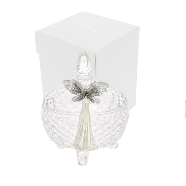 Bomboniera Crilù scatolina in vetro bohemia con fiori in filigrana cm. 10 x 11 e confezionata con sacchetto con 5 confetti gusto