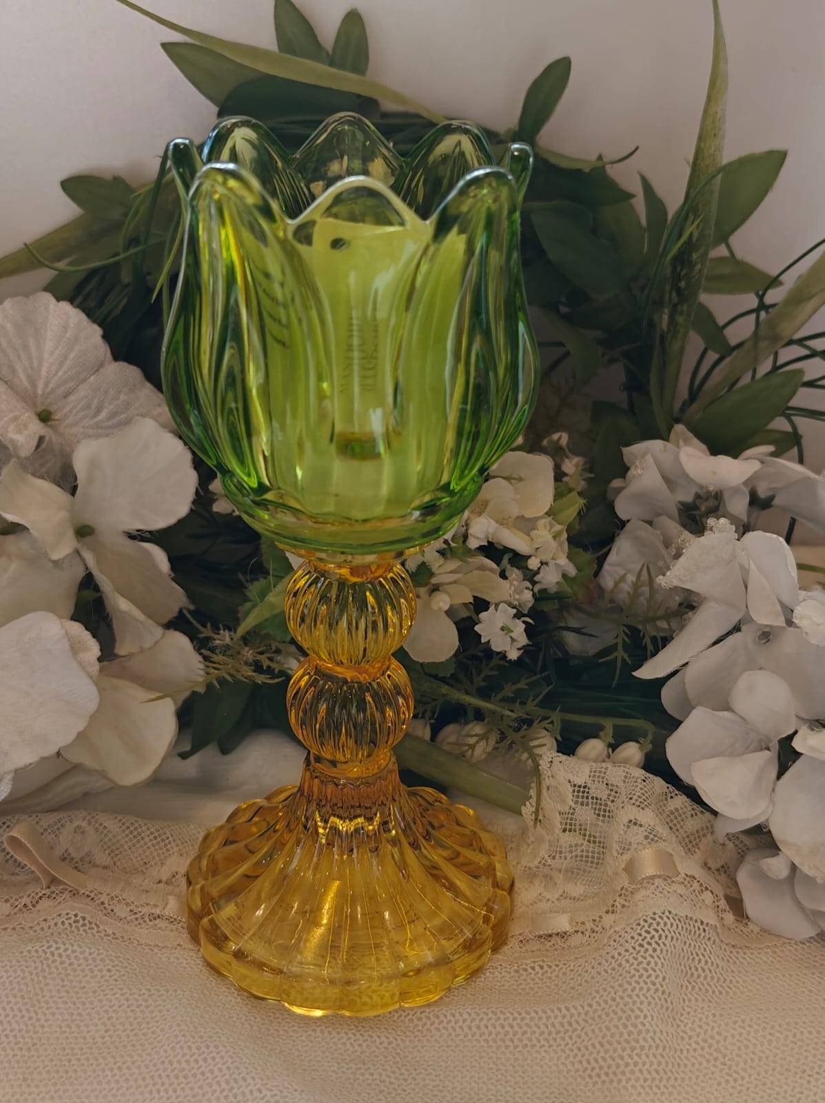 Bomboniera Portacandela tulipano in vetro bi colore cm 17, 8 completa di confezione