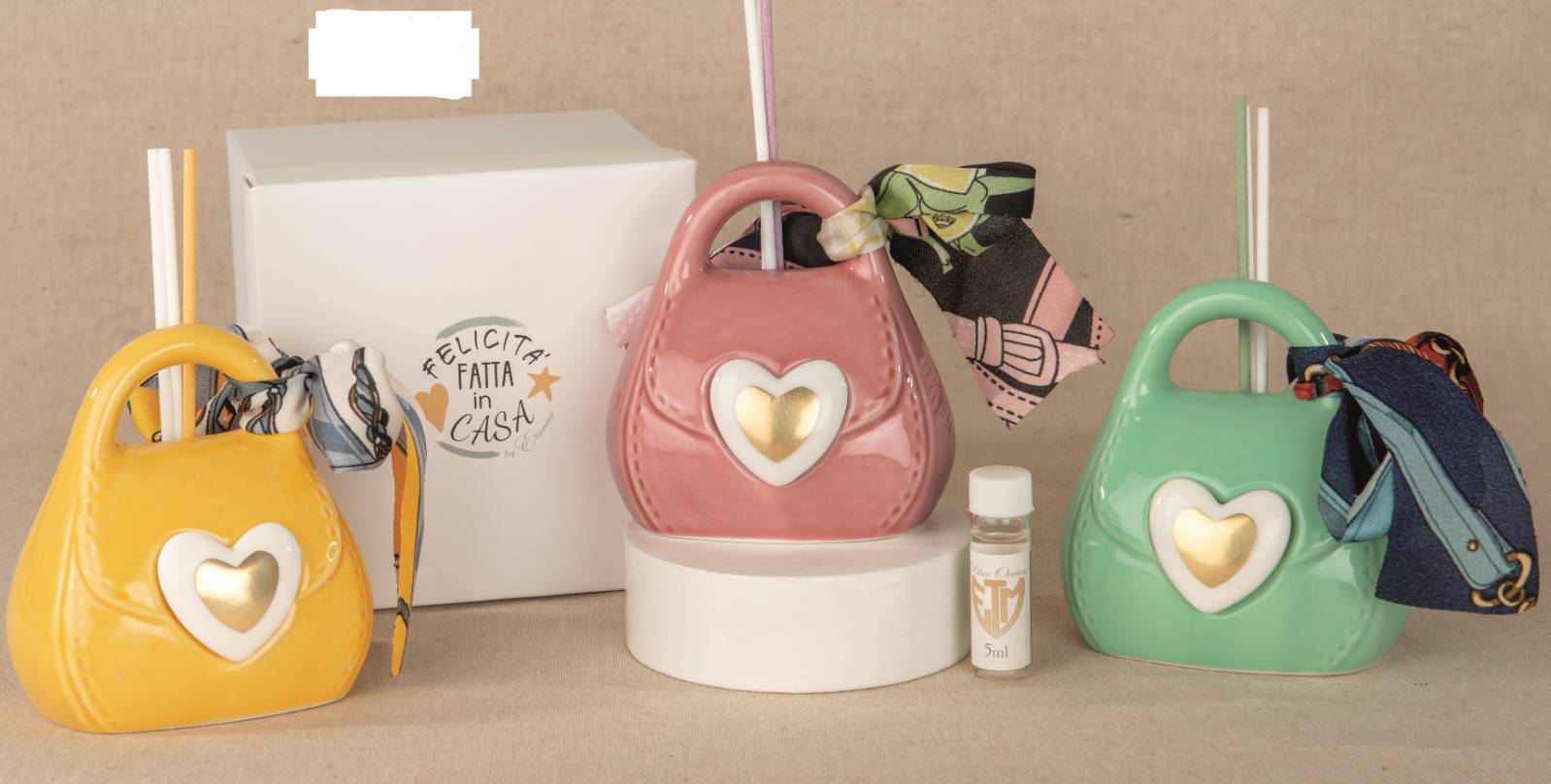 Profumatore borsetta cm. 10 h con scatola e addobbi sulla scatola,