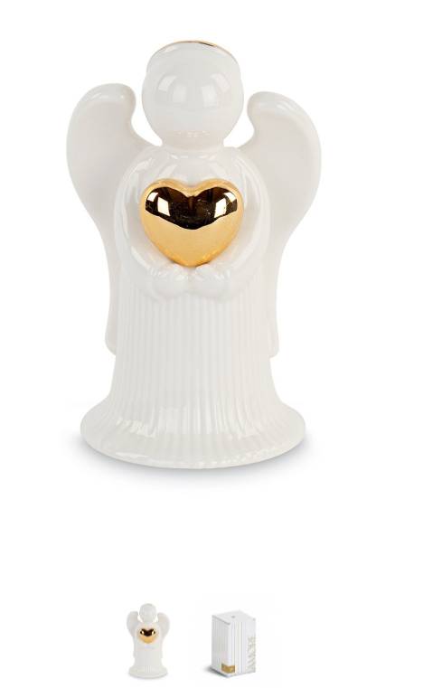 Angelo bianco plissè cuore oro in porcellana cm. 10 h con scatola personalizzata e confetti