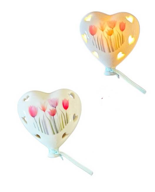 Palloncino a cuore con tulipani a led cm. 6,2 in porcellana con scatola e confetti