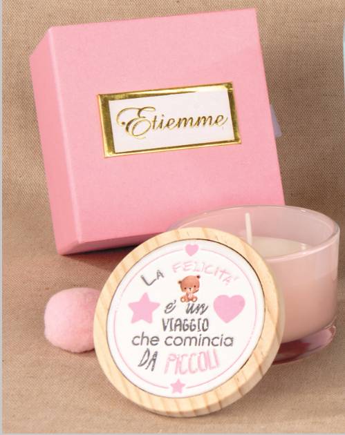 Candela sfavilla in ceramica con pensierino cm.7,5 X 6 con box personalizzata confezionata con 5 confetti gusto