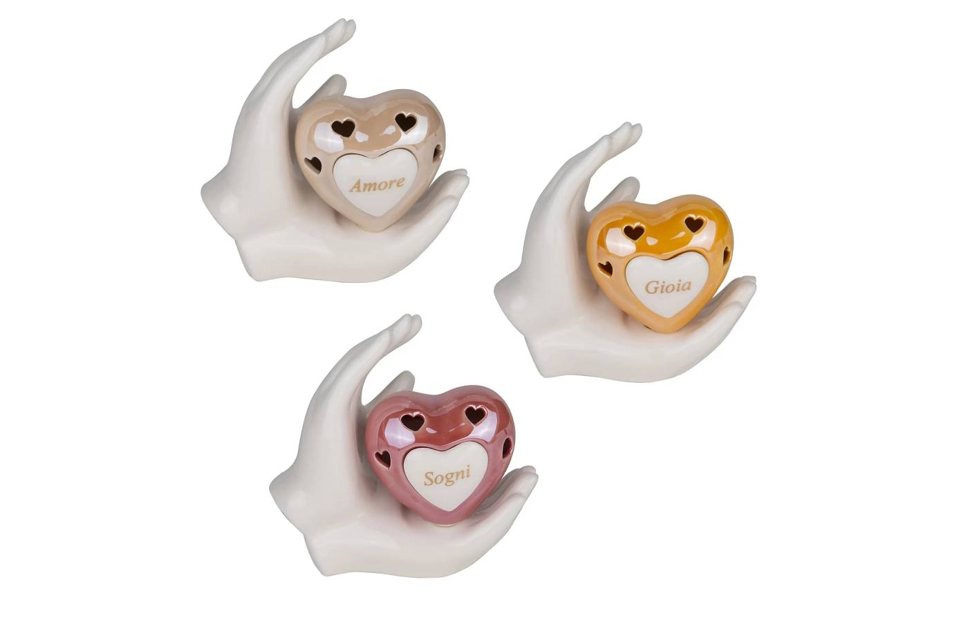 Bomboniera cuore led su mano in porcellana cm. 13 x 13 con scatola e confetti con scatola confezionata con 5 confetti gusto