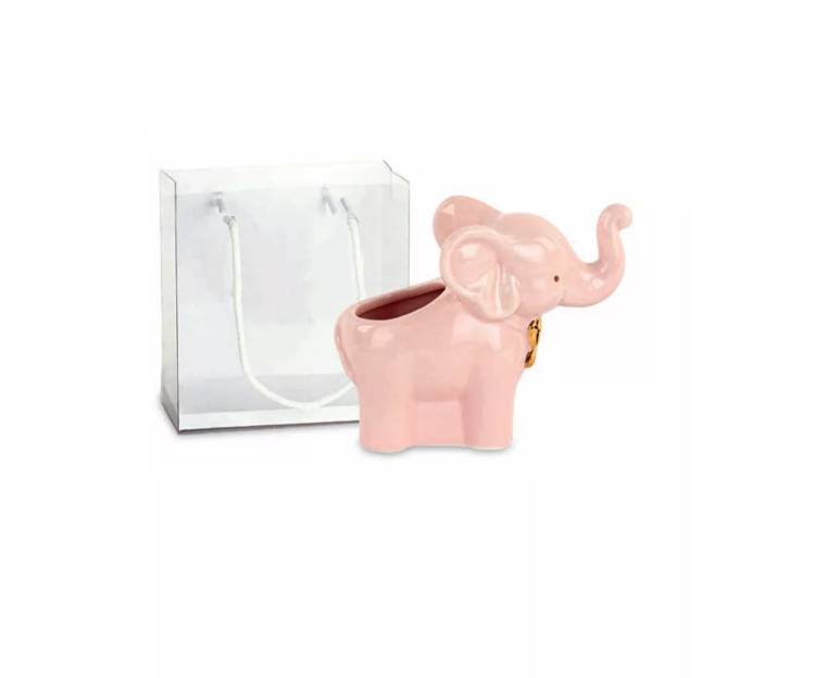 Elefantino cachepot con fiocco oro con shopper e confetti cm.10 x 13
