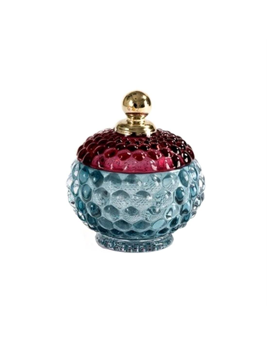 Vasetto di vetro lavorato blu e fucsia con astuccio diametro 9,8 x 11,2