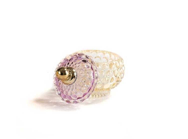 Vasetto di vetro lavorato giallo e lilla con astuccio diametro 9,8 x 11,2