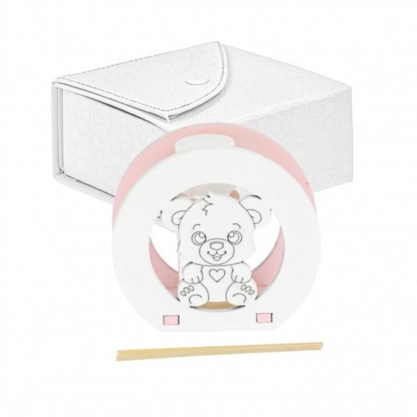Profumatore Orsetto in legno con scatola in pelle diametro 7 con profumo completa di confetti
