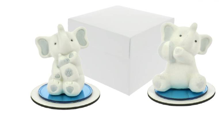 Bomboniera elefantino in porcellana su base in plexi completa di confezione cm 9 x 9 confezionata con sacchetto con 5 confetti gusto