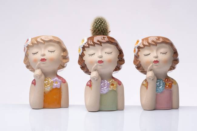 Porta piantina viso ragazza cm. 9 x 14 in resina completa di box e confetti confezionata con sacchetto con 5 confetti gusto