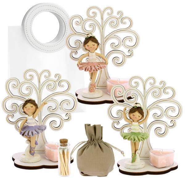 Bomboniera Albero con ballerina cm. 12 x 14 con candela, fiammiferi completa di confezione 3 assortite