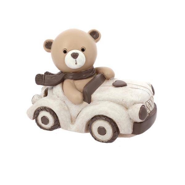 Bomboniera Salvadanaio Orsetto con auto cm. 13 x 8 x 9 in resina completo di confezione