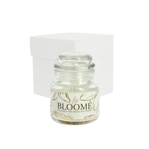 Bomboniera Candela profumata barattolo di vetro cm. 6,5 x 8,5 con scatola personalizzata e confezionata con 5 confetti gusto