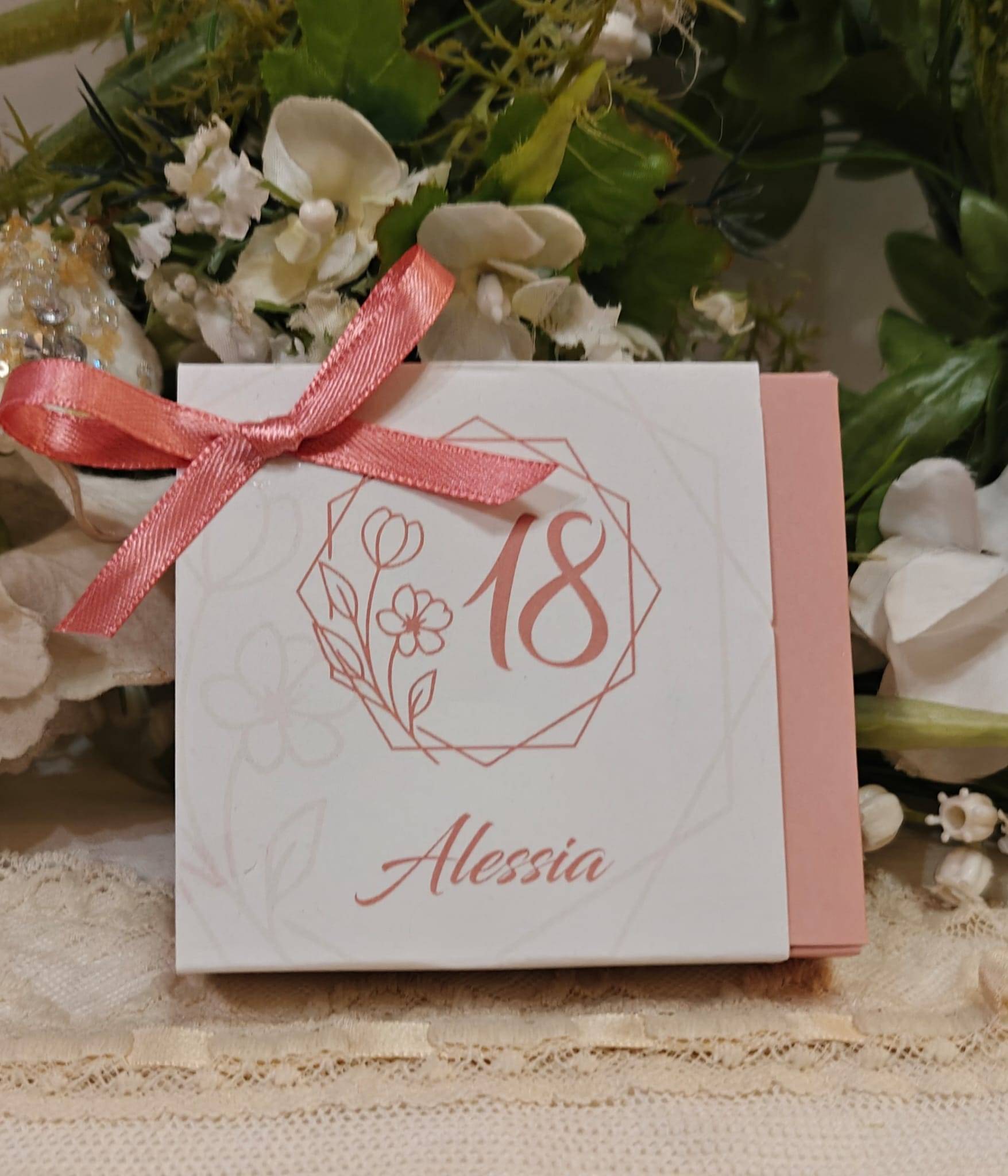 Scatolina 18 anni con il nome quadrata 8 x 8 x 2,5 p interno rosa antico completa di confetti