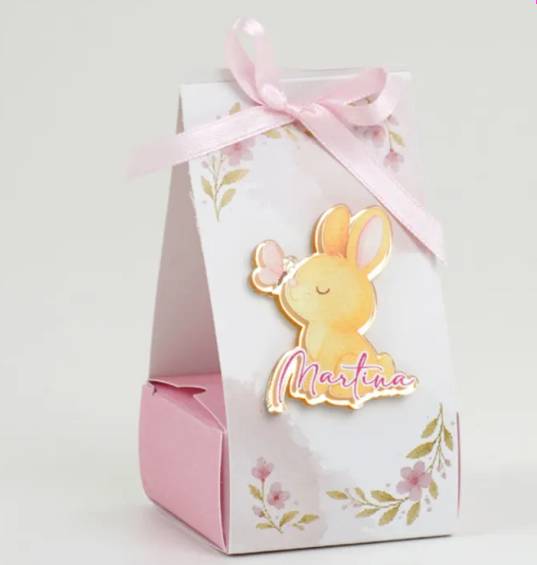 Scatolina Nascita con magnete in plexi coniglietto con il nome completa di confetti bigliettino in coordinato