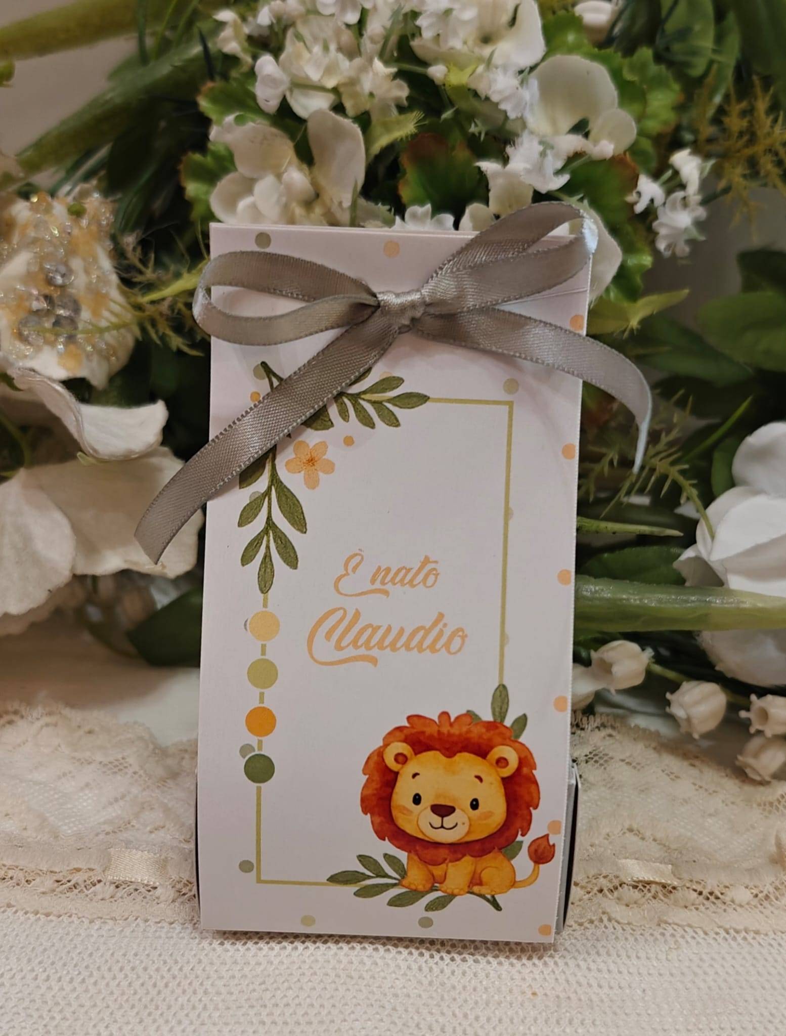 Scatolina Nascita leoncino con il nome completa di confetti bigliettino in coordinato