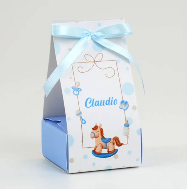Scatolina Nascita Cavallino con il nome completa di confetti bigliettino in coordinato