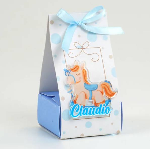 Scatolina Nascita cavallino con il nome con magnete in plexi completa di confetti bigliettino in coordinato