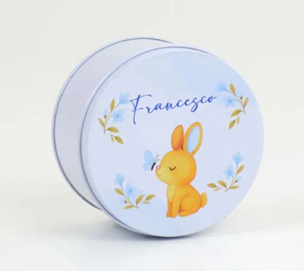 Scatolina Nascita rotonda in alluminio coniglietto con il nome completa di confetti bigliettino in coordinato