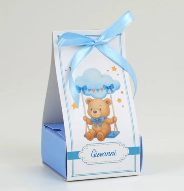Scatolina Nascita orsetto con il nome completa di confetti bigliettino in coordinato