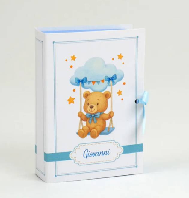 Scatolina Nascita orsetto con il nome completa di confetti bigliettino in coordinato