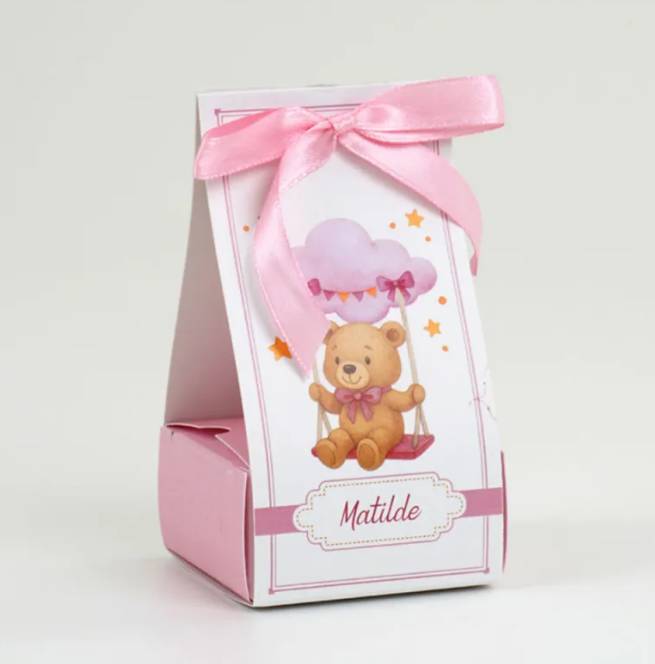Scatolina Nascita orsetto con il nome completa di confetti bigliettino in coordinato