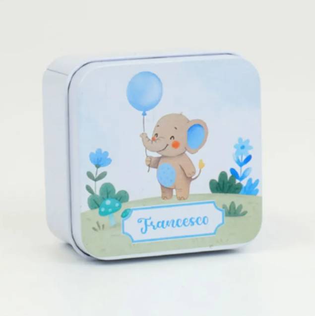 Scatolina Nascita in alluminio elefantino con il nome completa di confetti bigliettino in coordinato