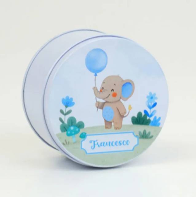 Scatolina Nascita in alluminio elefantino con il nome completa di confetti bigliettino in coordinato