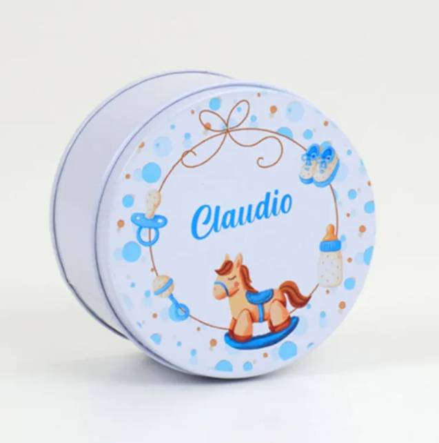 Scatolina Nascita in alluminio cavallino con il nome completa di confetti bigliettino in coordinato