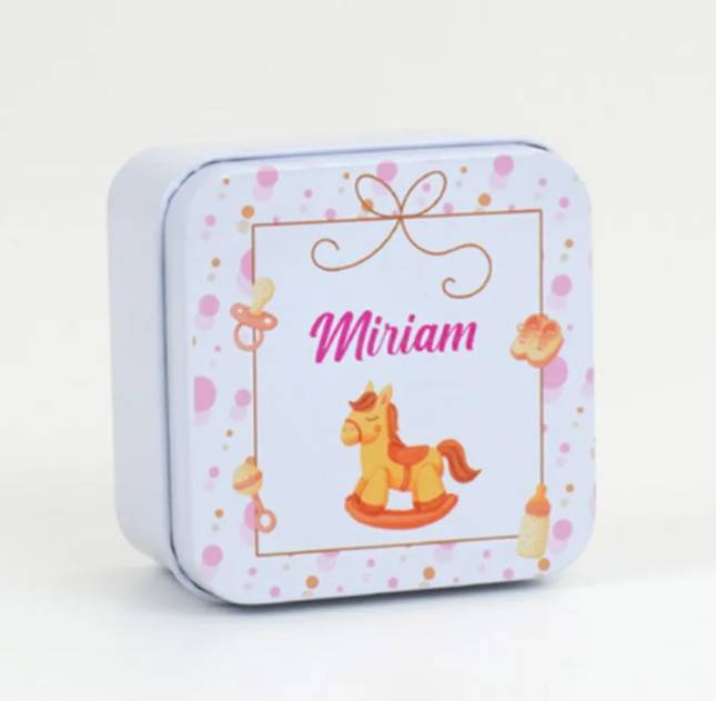 Scatolina Nascita in alluminio cavallino con il nome completa di confetti bigliettino in coordinato