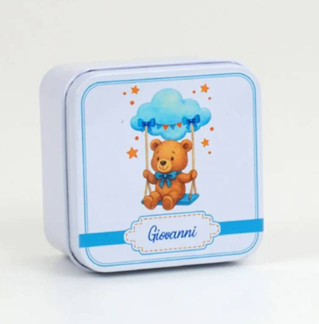 Scatolina Nascita in alluminio ORSETTO con il nome completa di confetti bigliettino in coordinato