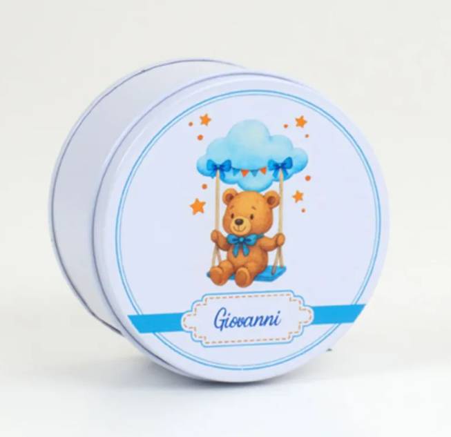 Scatolina Nascita in alluminio ORSETTO con il nome completa di confetti bigliettino in coordinato