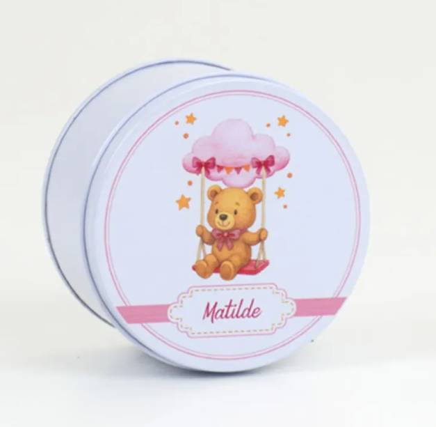 Scatolina Nascita in alluminio ORSETTO con il nome completa di confetti bigliettino in coordinato