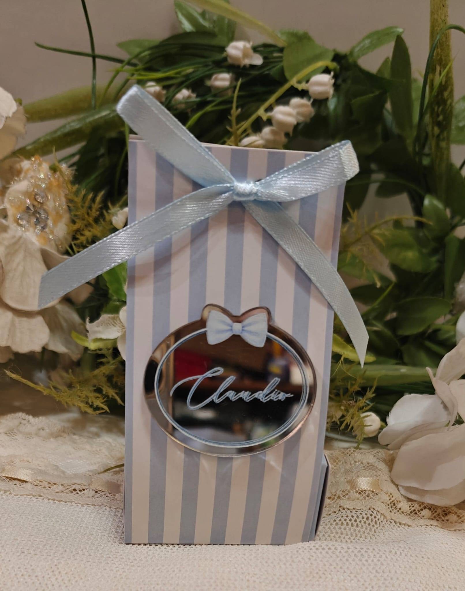 confezionata con confetti mandorla o cioccolato e biglietto incluso in coordinato.