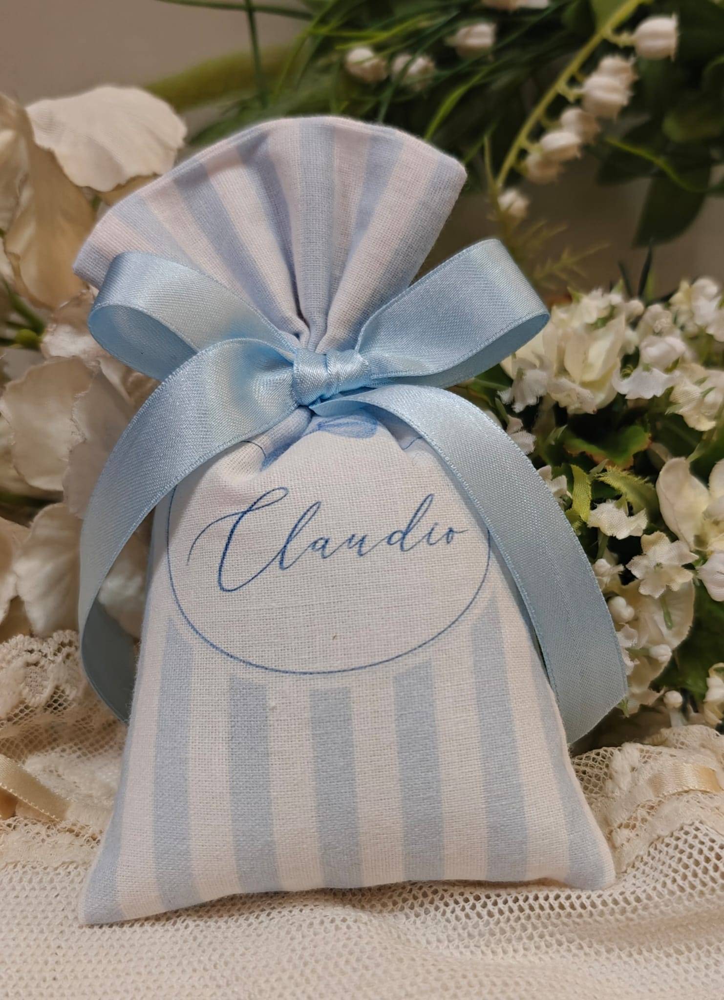 Sacchetto di cotone a righe stampato personalizzato con il nome cm. 8 x 15 ORDINE MINIMO 20 PEZZI