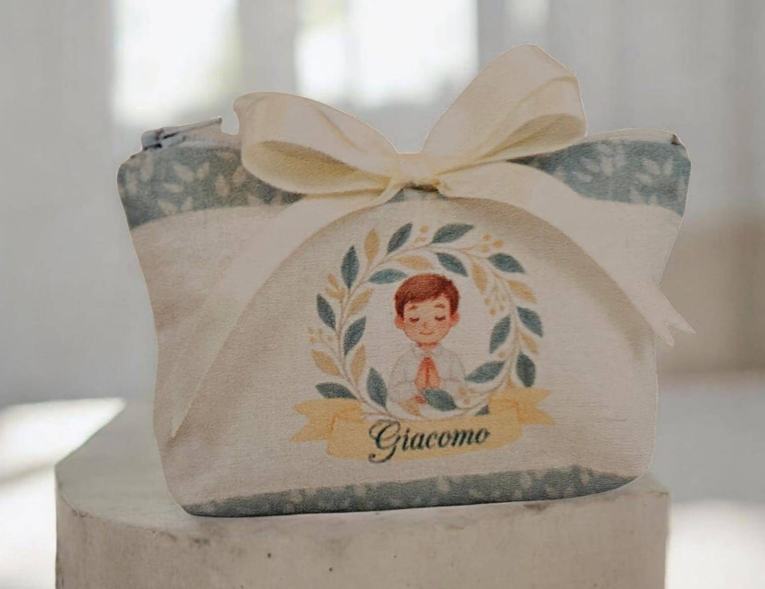 Bustina con cerniera di cotone prima comunione stampato personalizzato con il nome cm. 15 x 10 ORDINE MINIMO 20 PEZZI