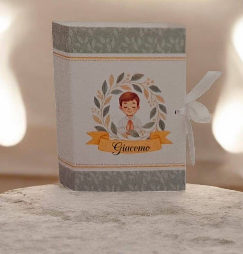 Scatolina Prima Comunione a libro con il nome completa di confetti bigliettino in coordinato