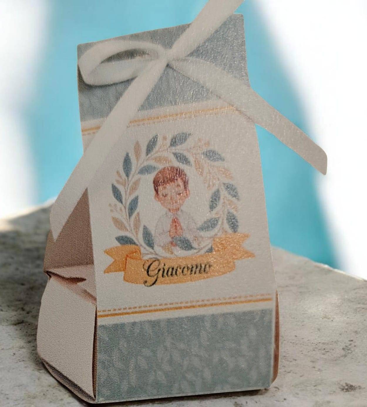 Scatolina Prima Comunione con il nome completa di confetti bigliettino in coordinato