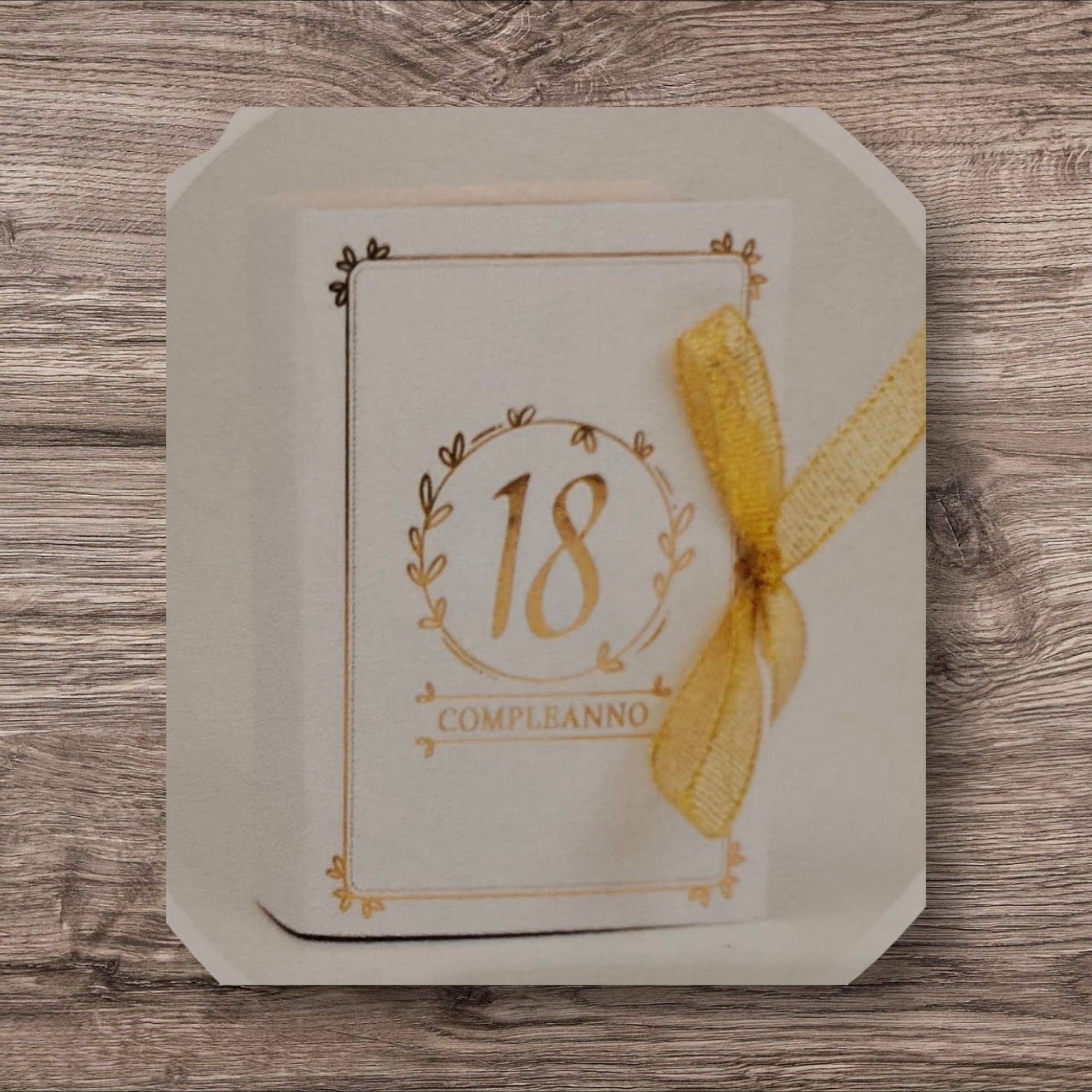 Scatolina 18 anni con il nome quadrata 7 x 10 x 3 p interno oro completa di confetti