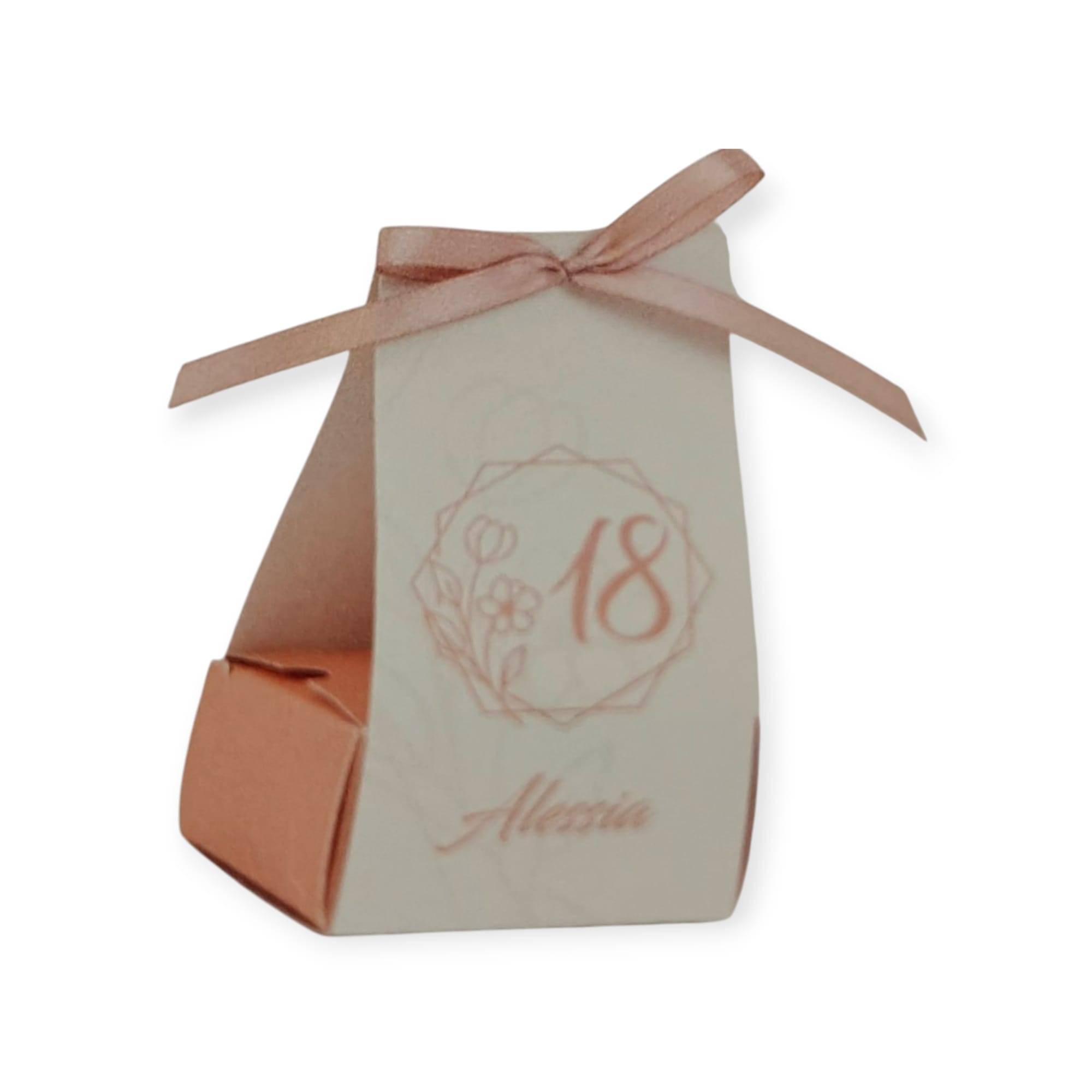 Scatolina 18 anni con il nome quadrata 6 x 10,5 x 6 p interno rosa antico completa di confetti