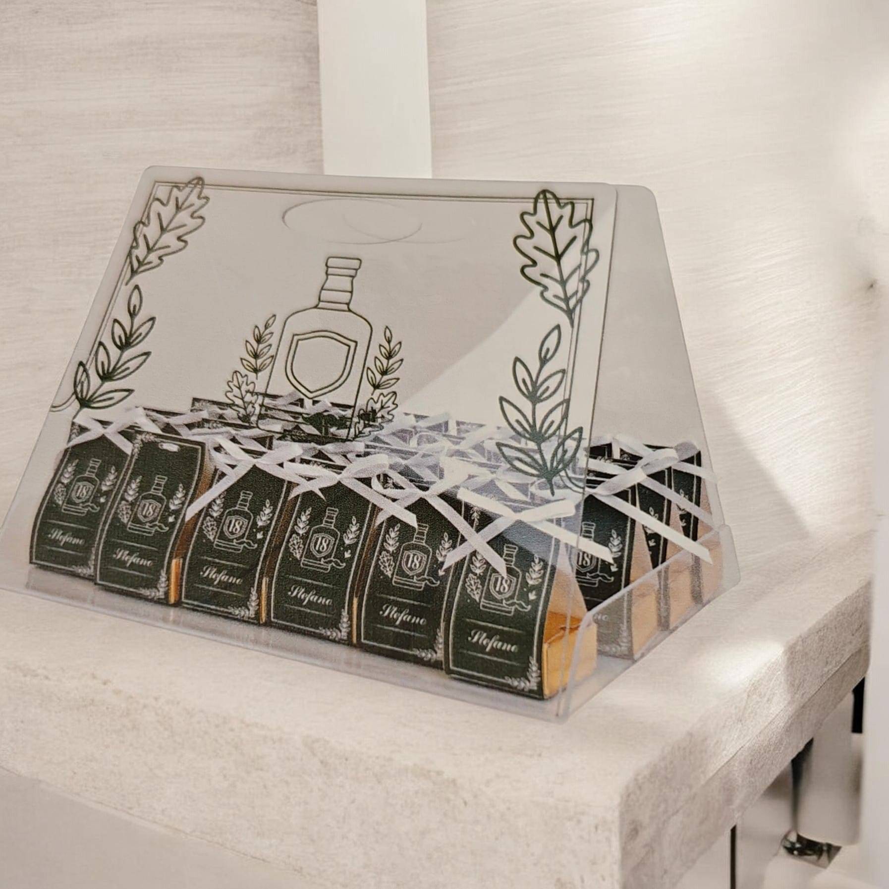 Espositore con 24 Scatoline in cartoncino pregiato gr. 200 personalizzata misura l 6 h10,5 p 6 con 5 confetti o