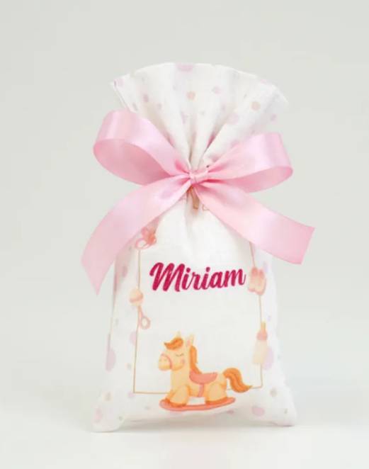 SACCHETTO NASCITA CAVALLINO CON IL NOME E CONFETTI