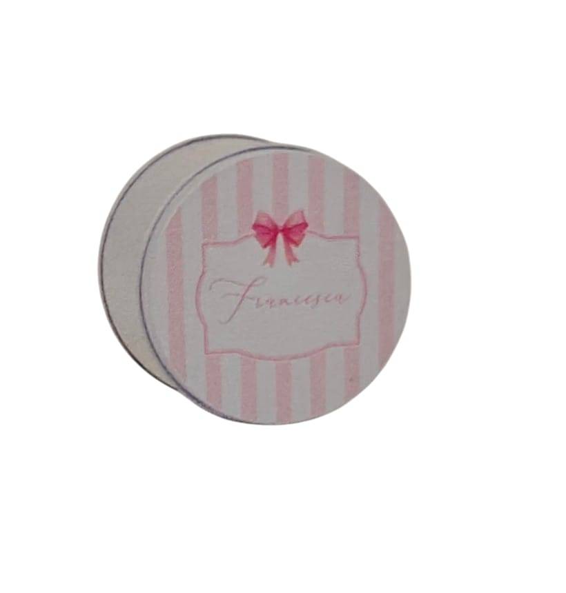 Scatoline rotonda in alluminio personalizzata misura cm. 6,5 x 6,5 p.4 arricchita con nastro