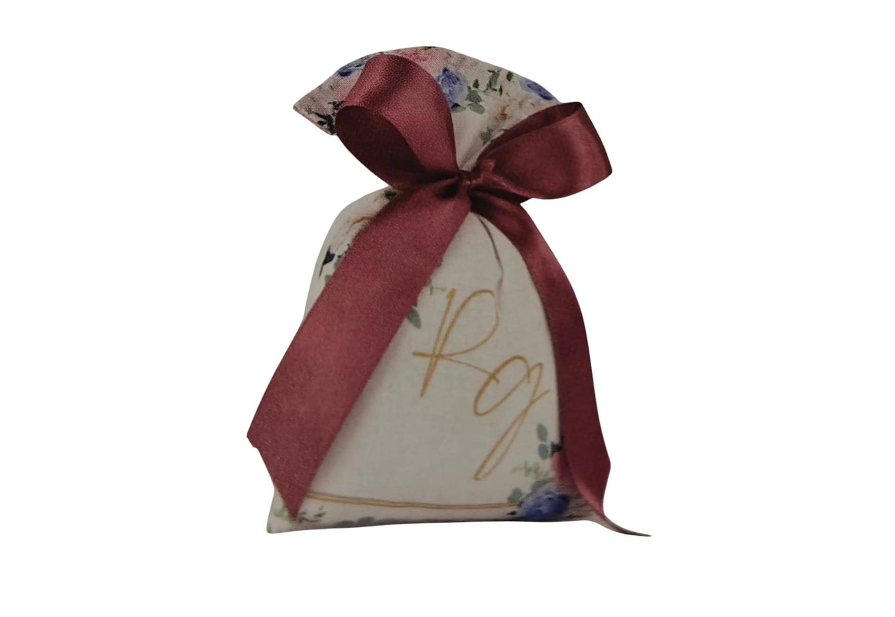 Sacchetto Matrimonio di cotone stampato con iniziali sposi 12 x 15 x 6 completo di confetti