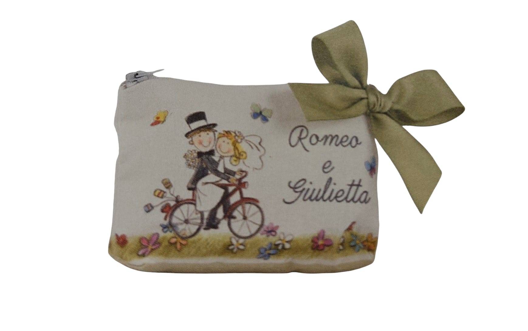 Bustina Matrimonio con cerniera di cotone stampato con iniziali sposi 12 x 8 x 4,5 completo di confetti