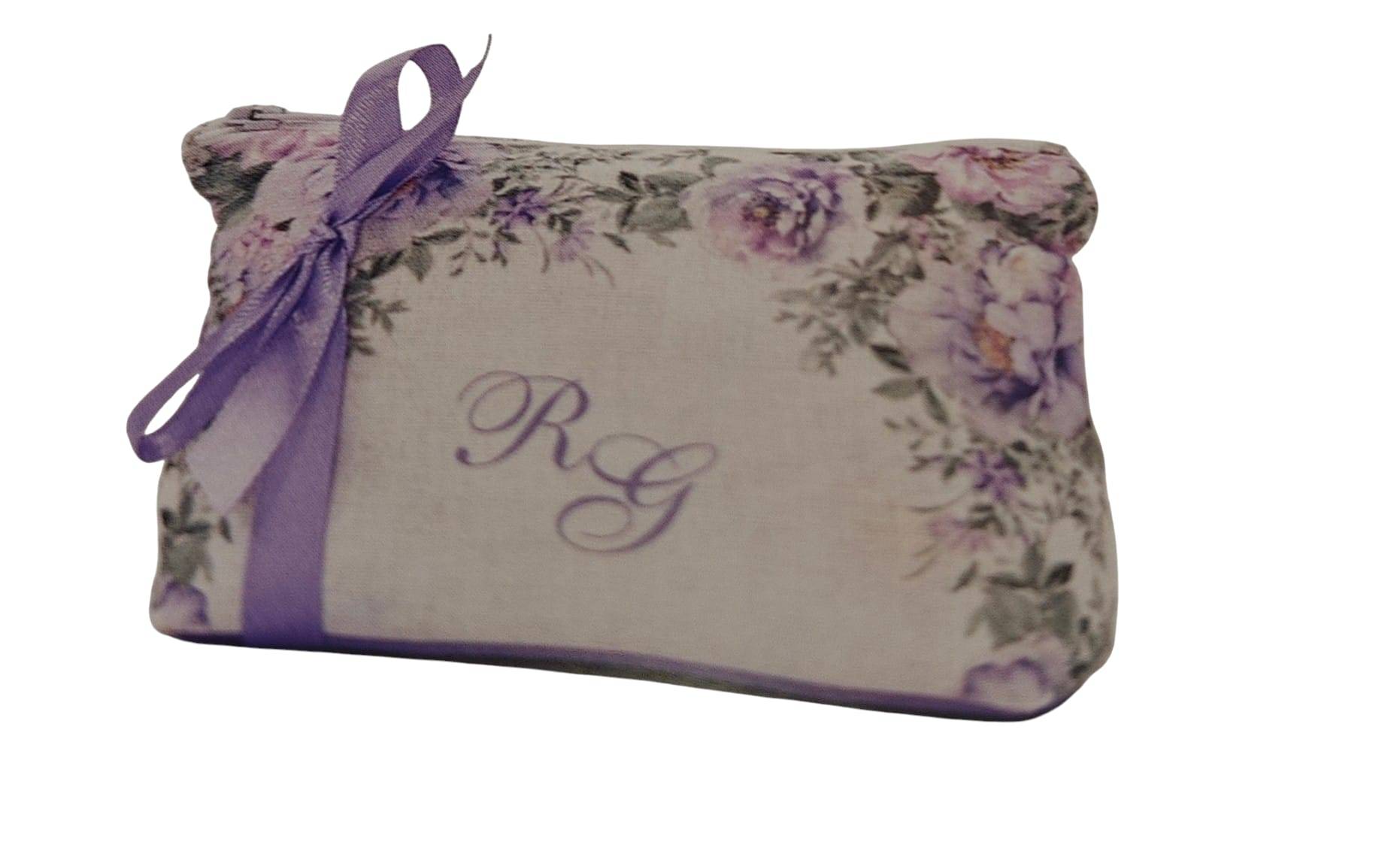Bustina Matrimonio con cerniera di cotone stampato con iniziali sposi 12 x 8 x 4,5 completo di confetti