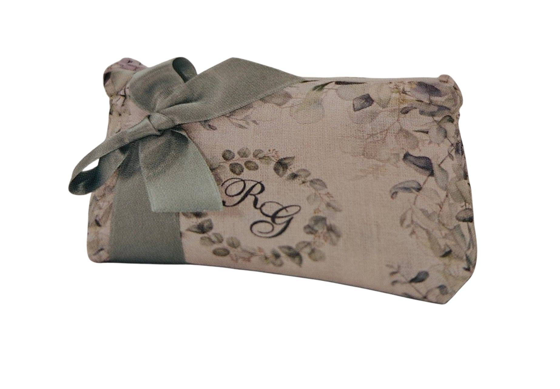 Bustina Matrimonio con cerniera di cotone stampato con iniziali sposi 12 x 8 x 4,5 completo di confetti