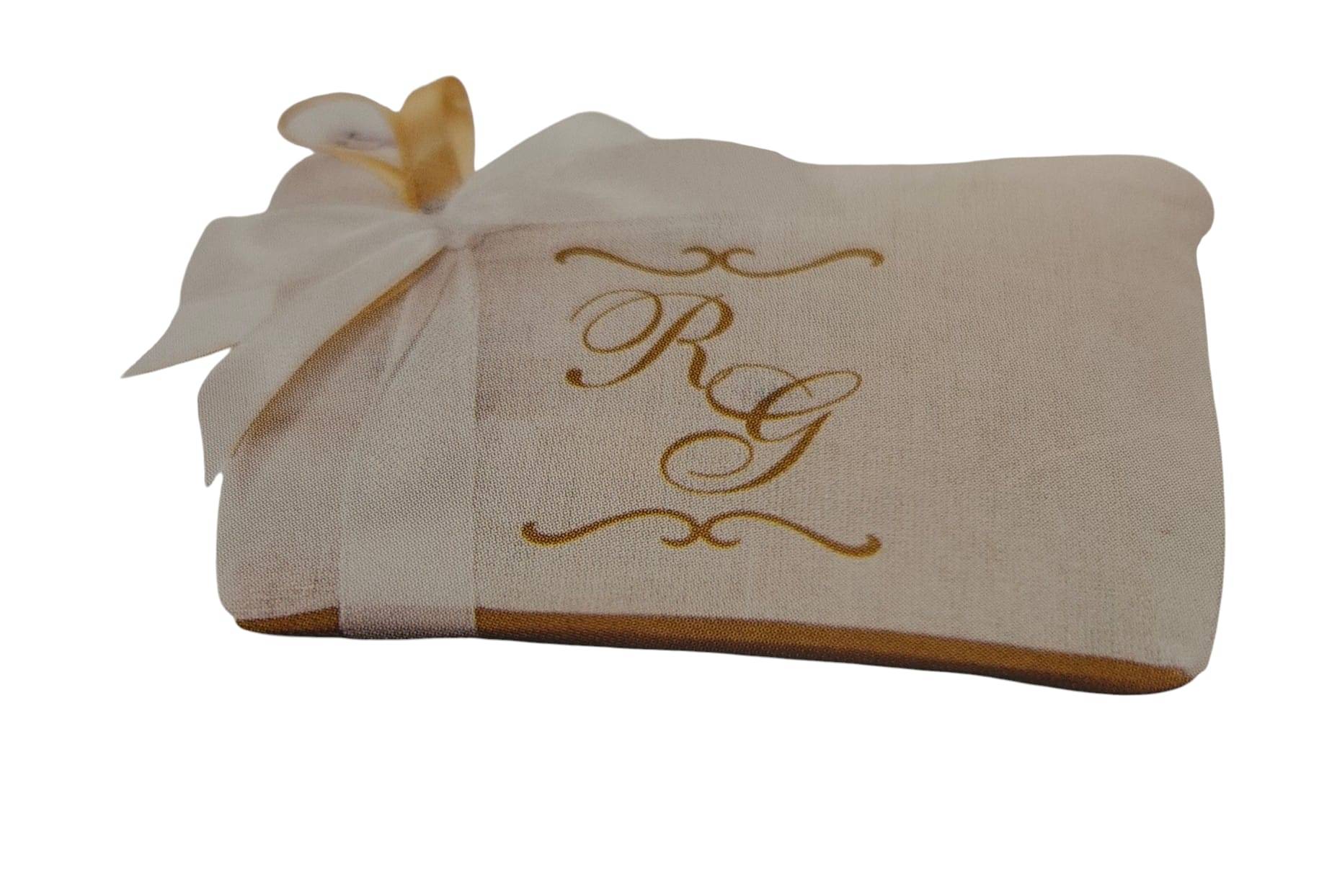 Bustina Matrimonio con cerniera di cotone stampato con iniziali sposi 12 x 8 x 4,5 completo di confetti