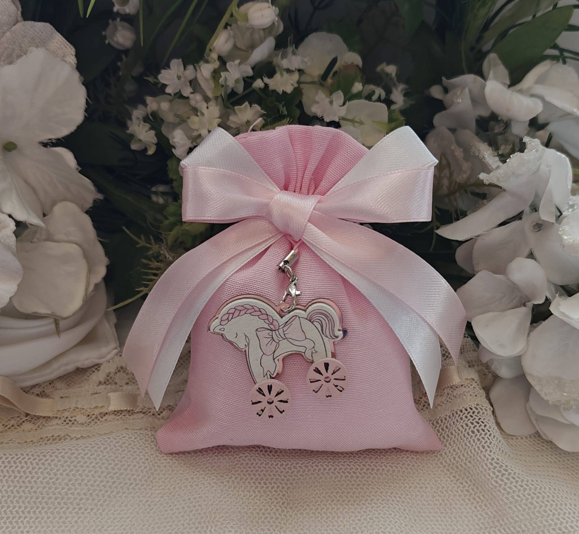 Sacchetto nascita in rigatino made in Italy con portachiavi cavallino completo di confetti