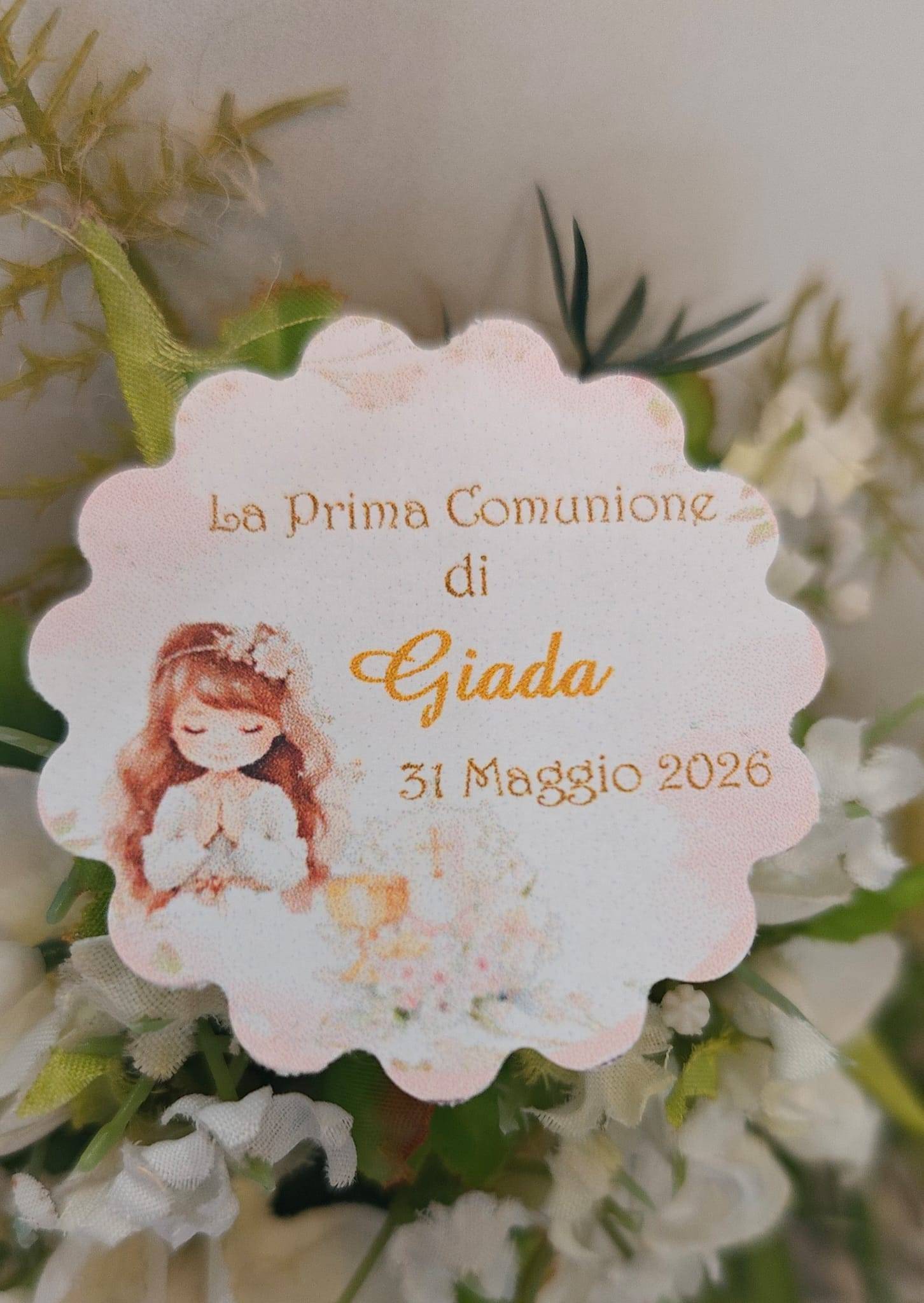 Bigliettino rotondo personalizzato per Prima Comunione da attaccare alla bomboniera,