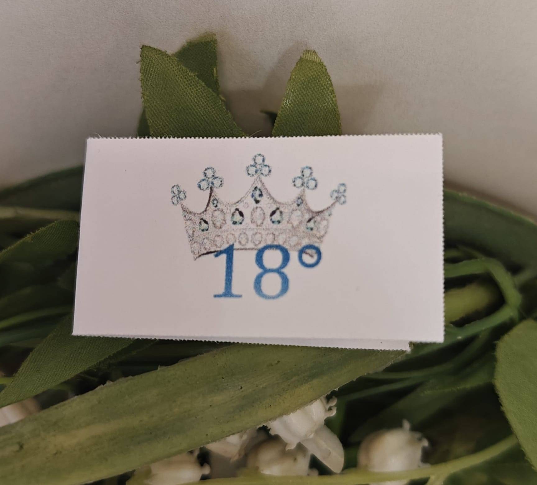Bigliettino 18 anni in coordinato all'invito, segna tavolo, cono confettata, menù, scatolina misura 5 ×3 cm, realizzato in cartoncino pregiato gr.250.